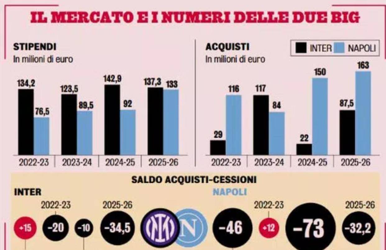 《米兰体育报》最近的统计显示,那不勒斯近年来在球队建设上的投入甚至超过国际米兰。在转会费方面,那不勒斯过去四个赛季分别投入1.16亿欧元、0.84亿欧元、1.5亿欧元和1.63亿欧元;同期,国际米兰分别投入0.29亿欧元、1.17亿欧元、0.22亿欧元和0.875亿欧元,那不勒斯的投入明显更高。年薪总额方面,国际米兰基本保持稳定,而那不勒斯自斯帕莱蒂执教以来年薪一路上升,本赛季已达到1.33亿欧元,与国际米兰大致持平。转会净投资方面,国际米兰四年总共投入4950万欧元,而那不勒斯高达1.392亿欧元,几乎是三倍之差。这说明那不勒斯在球队建设上投入了大量资金。